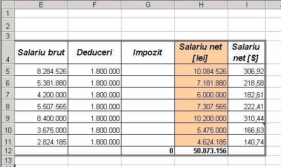 IF(E5>=5.000.000;E5*25%;E5*15%) daca salariul brut este mai mare sau egal cu 5.000.000 atunci impozitul este 25% din salariu, altfel impozitul este 15% din salariu.