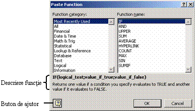 n &nb 313i82d sp; &nb 313i82d sp; &nb 313i82d sp; &nb 313i82d sp; Function category (Categoria functiei) permite īmpartirea functiilor Excel īn categorii pe care le gasesti descrise īn tabelul care urmeaza: