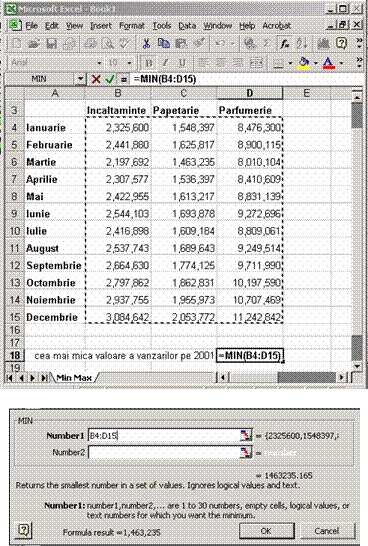 īntoarce valoarea cea mai mica, sau minimul, dintr-un domeniu de numere. Daca toate valorile se situeaza pe o coloana, cea mai simpla metoda de aflare a minimului este de a sorta coloana. Daca este vorba de un domeniu, atunci functia MIN este mai utila.