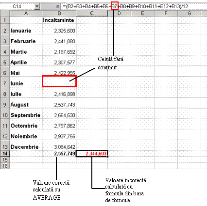 este o functie comuna si usor de utilizat. Rezultatul acestei functii este media aritmetica a argumentelor din domeniul selectat. Este bine de stiut ca rezultatul returnat de aceasta functie este mult mai corect decāt daca ai aduna argumentele respective si le-ai īmparti la numarul lor deoarece daca, la un moment dat, o celula nu are valoare numerica, prin aceasta metoda se interpreteaza valoarea 0 pentru aceasta celula. Functia AVERAGE aduna celulele din domeniul selectat si īmparte valoarea la numarul de celule fara a lua īn calcul celulele goale.