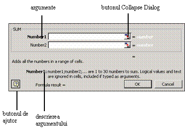 In momentul in care ai selectat o functie din campul Function name se deschide o caseta care se numeste Formula Pallette (Paleta de formule) care permite introducerea argumentelor pentru functia selectata.