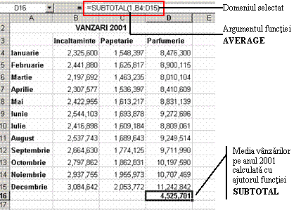 este o functie comuna si usor de utilizat. Rezultatul acestei functii este media aritmetica a argumentelor din domeniul selectat. Este bine de stiut ca rezultatul returnat de aceasta functie este mult mai corect decat daca ai aduna argumentele respective si le-ai imparti la numarul lor deoarece daca, la un moment dat, o celula nu are valoare numerica, prin aceasta metoda se interpreteaza valoarea 0 pentru aceasta celula. Functia AVERAGE aduna celulele din domeniul selectat si imparte valoarea la numarul de celule fara a lua in calcul celulele goale.