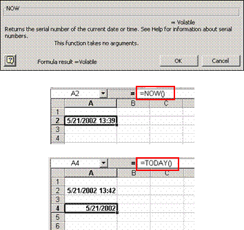Functia NOW returneaza data si ora curenta iar functia TODAY returneaza numai data curenta. Aceste functii nu au argumente. Pentru a le utiliza selecteaza-le din caseta Paste Function din categoria Date&Time dupa ce ai selectat, in prealabil celula in care doresti sa regasesti aceasta informatie.