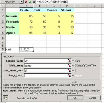 HLOOKUP("carti",E1:H5,2,TRUE) = 50