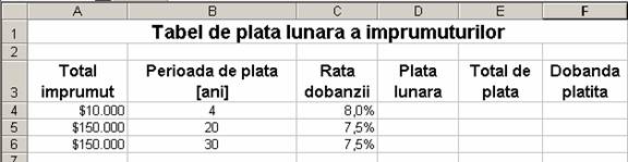 Obs. Pentru a afla valoarea totala de plata pe durata împrumutului înmulteste valoarea returnata de functia PMT cu valoarea argumentului nper.