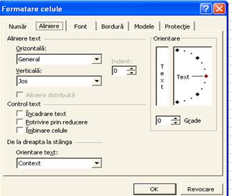 Optiunea Orientare stabileste rotatia textului (modificarea orientarii) în celulele selectate. Valoarea implicita este 00 (adica linia de baza a textului este orizontala). Înclinarea textului poate fi modificata cu valorile selectate în câmpul Grade. Valorile posibile sunt între -900 si 900. Daca se doreste orientarea verticala a continutului celulei sau celulelor selectate, atunci se va efectua un clic în zona etichetata Text.