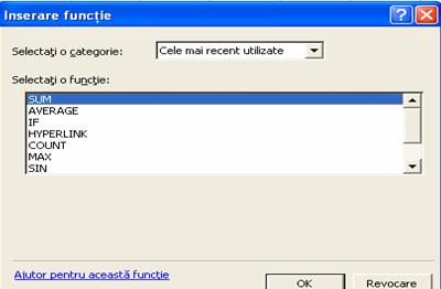 Din lista etichetata Selectati o categorie se selecteaza categoria functiei care urmeaza sa fie inserata. Categoriile care pot fi selectate sunt:
