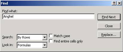 n Optiunea Find entire cells only gaseste numai celulele care contin in intregime specificatia din campul Find What (nu si cele care incep cu acea specificatie).