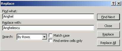 Daca aceasta prima aparitie trebuie sa fie inlocuita executa click pe butonul Replace: executa click pe butonul Find Next pentru a sari la urmatoarea aparitie, pastrand continutul original al celulei.
