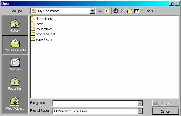 Nota: De fiecare data când doriti sa lucrati cu un registru de lucru Excel, trebuie sa îl deschideti. În caseta de dialog Open aveti la dispozitie mai multe optiuni. Daca este necesar, efectuati clic pe sageata orientata în jos a listei derulante Look In si selectati un dosar din lista. Pentru a va deplasa cu un nivel mai sus în ierarhia dosarelor, efectuati clic pe butonul Up One Level (un nivel mai sus) din bara de instrumente a casetei de dialog Open. Daca efectuati dublu clic pe un subdosar, continutul acestuia va aparea în lista Files and Folders (fisiere si dosare)