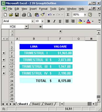 Daca grupezi lunile aditionale poti prezenta trimestrele sau lunile executând click pe butoanele de structura. În plus, poti folosi butoanele 1 si 2 din partea de sus a zonei structurii (la stânga etichetelor de coloana) pentru a controla nivelurile de grupare afisate în întreaga lista. Executa click pe butonul 1 si vei restrânge întregul grup astfel încât sa ramâna doar totalurile. Executa click pe butonul 2 pentru a extinde lista afisând toate liniile. Este posibil ca lista ta sa contina si alte nivele, caz în care butoanele vor fi numerotate cu 3, 4 si asa mai departe.