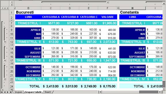 Nu doar liniile pot fi grupate ci si coloanele. Prin gruparea coloanelor poti restrânge la maxim lista, afisând doar totalurile - dupa cum se prezinta în imaginea urmatoare.