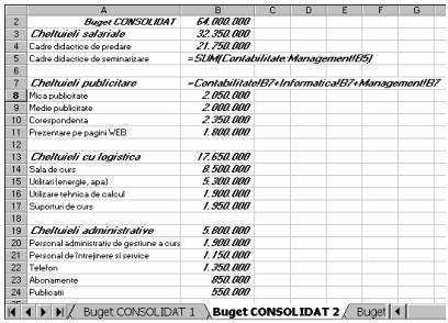 se introduce formula de însumare =SUM(A3:E15;5;B30:C31) în coltul superior stâng al tabelei de ipoteze (la adresa B35). Formula va genera rezultate centralizate pentru fiecare functie si compartiment în parte;