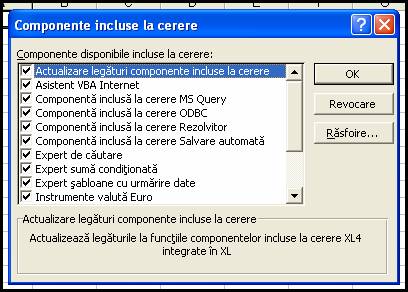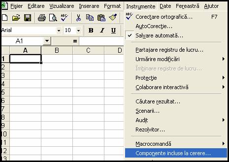 Daca totusi vreti sa le instalati, urmariti Fig A1 si Fig A2. Se apeleaza întâi Fig A.1 se face clic pe componente incluse la cerere si se obtine Fig A.2. nu este nevoie sa le bifati pe toate. Bifati Rezolvitor neaparat. Instalarea cere putina rabdare. Daca nu aveti experienta apelati la o persoana priceputa, care are si rabdarea sa explice ce face si de ce face asa. |