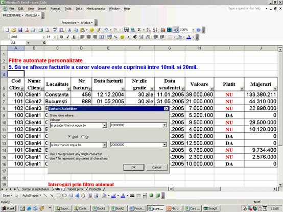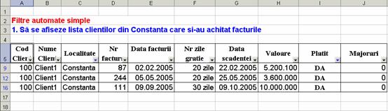 Nota: pentru exemplificare, vezi fisierul Curs Excel, foaia de calcul „Filtre”.