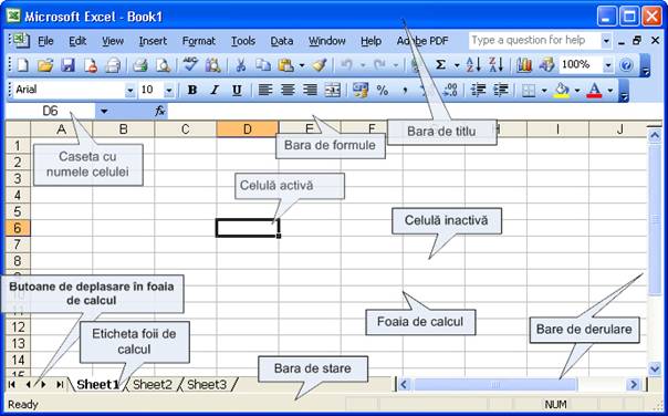 Ecranul de deschidere prezinta un registru de calcul gol, avānd numele Book1. Īn cadrul acestui registru de calcul se gasesc standard trei foi de calcul, etichetate Sheet1, Sheet2, Sheet3, ele reprezintānd spatiile de lucru. Etichetele se afla īn partea de jos a ecranului si va permit sa treceti dintr-o foaie de calcul īn alta cu ajutorul mouse-ului. O alta varianta pentru a va deplasa cu ajutorul tastaturii dintr-o pagina īn alta sunt combinatiile de taste: Ctrl+PgDn si Ctrl+PgUp.