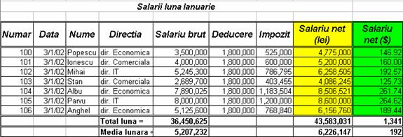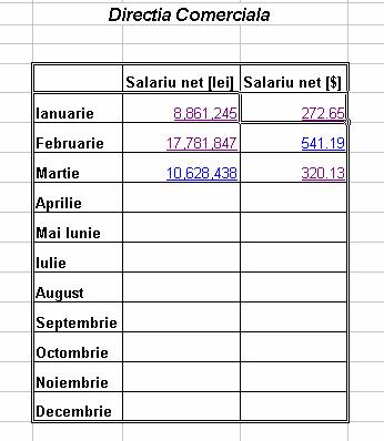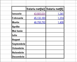 În celula C3 sa se insereze titlul Salariu net [lei] iar în celula D3 Salariu net [$].