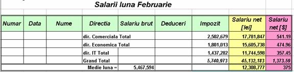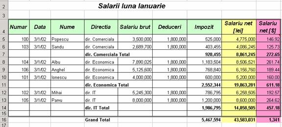 Pentru fiecare luna creaza subtotaluri pentru fiecare directie pe Impozit, Salariu net[lei] si Salariu net[$]. Sa se refaca linierea tabelului.