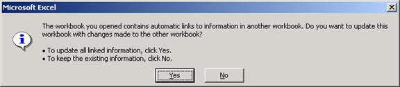 n Daca registrul sursa a fost sters, mutat sau i-ai schimbat numele, poti executa click pe No pentru a pastra valorile curente si a rescrie referintele sau click pe Yes dupa care folosesti caseta File Not Found pentru a cauta noua localizare a registrului sursa; pentru a rezolva permanent legatura trebuie sa refaci formulele.