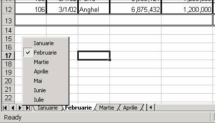 Nota: Daca vrei sa apelezi rapid o foaie de calcul a carei eticheta nu este vizibila pe ecran efectueaza click dreapta pe butoanele de derulare a foilor pentru a obtine un meniu rapid ce prezinta toate foile din registrul de calcul. Efectueaza click pe eticheta foii dorite.