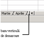 Obs. Dupa ce ai introdus si redenumit foi de calcul este posibil sa nu mai vizualizezi toate foile de calcul existente. Ca sa eviti aceasta situatie poti folosi denumiri cat mai scurte pentru foi sau poti extinde zona de vizualizare a etichetelor executand click pe separatorul de casete – bara verticala din extremitatea stanga a barei de derulare orizontala– si tragandu-l spre dreapta. Acest lucru reduce lungimea barei de derulare si ofera mai mult spatiu pentru etichetele de foaie.