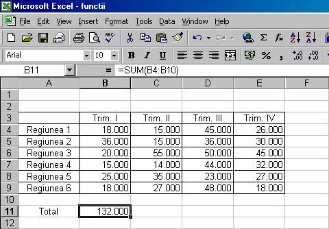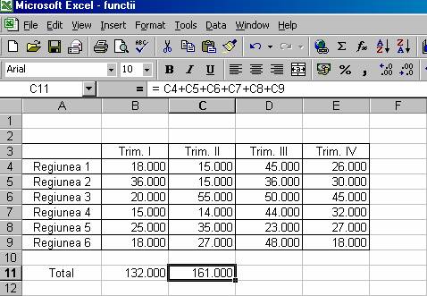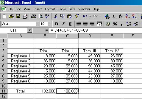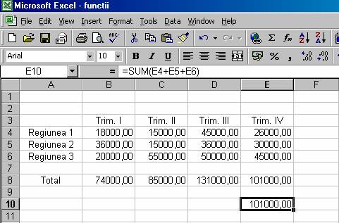 Introduceti o formula (de exemplu = SUM (E4+E5+E6)) în celula E10.
