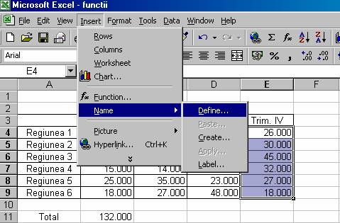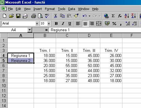 Nota: Puteti crea nume de domenii care simplifica procesul de creare a formulelor si deplasarea la domeniul respectiv. De exemplu, o formula unde scrie Trim1 este mai usor de înteles decât B4:B9. Nu numai ca un nume este mai usor de retinut decât adresele celulelor, dar programul Excel afiseaza si numele domeniului în caseta name, lânga bara cu formule.