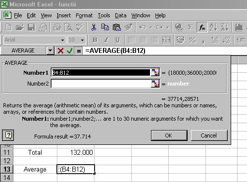 Efectuati dublu clic pe optiunea Average din caseta cu lista Function Category, Function Name. Programul Excel va selecta un domeniu de celule a carui medie presupune ca doriti sa o calculati.