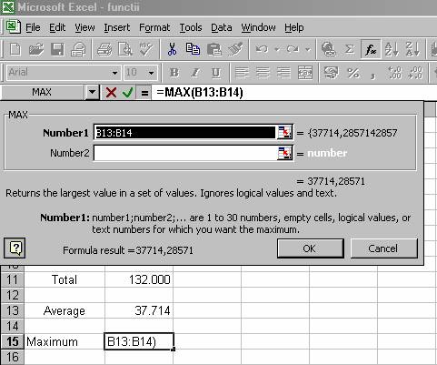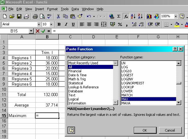 Efectuati dublu clic pe optiunea Max din caseta cu lista Function Category, Function Name. Programul Excel va selecta un domeniu de celule a carui valoare maxima presupune ca doriti sa o gasiti.