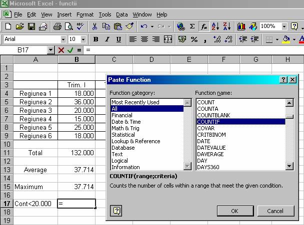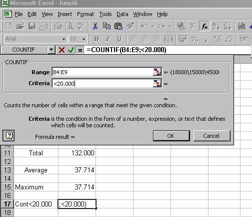 Selectati domeniul de celule sau numele domeniului B4:E9, apasati tasta Tab, si tastati <20.000, apoi apasati tasta Enter. Rezultatul va aparea în celula activa si functia va fi afisata în bara cu formule.