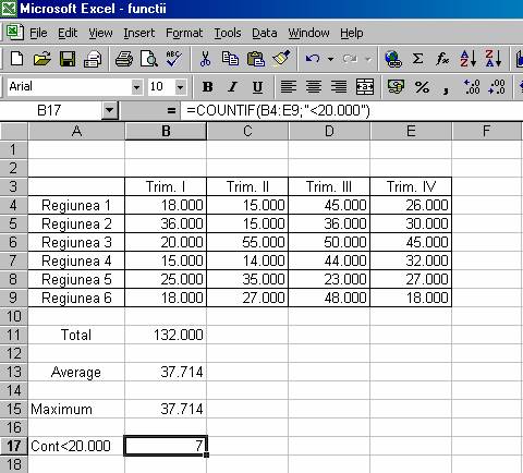 Nota: Prin introducerea functiei Count If puteti afla de exemplu care au fost regiunile cu valori trimestriale mai mici de 20.000 dolari.