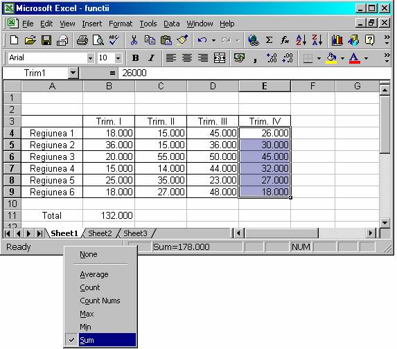 Nota: Aceasta functie nu insereaza valoarea în foaia de calcul ci o afiseaza doar în bara de stare. Puteti dezactiva facilitatea AutoCalculate selectând None din meniul scurtatura AutoCalculate