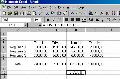 Introduceti o formula (de exemplu = SUM (D3+D4+D5+D6)) în celula D10.