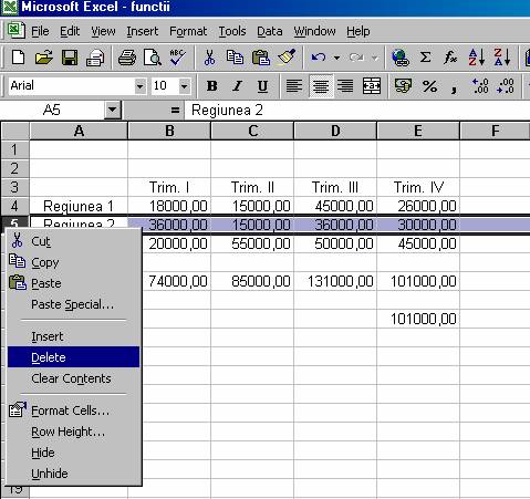 Efectuati clic cu butonul drept al mouse-ului pe antetul rândului cu nr. 5 si selectati Delete din meniul scurtatura. Veti primi eroarea #REF!, deoarece valoarea din celula mentionata din rândul nr. 5 nu mai este disponibila în formula.