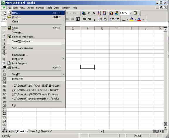 In momentul in care lansezi in executie aplicatia, Excel deschide un nou registru de calcul si ii atribuie un nume generic (ex: Book1). Daca aplicatia este deschisa si vrei sa creezi un nou registru de calcul atunci trebuie sa folosesti secventa FileNew.