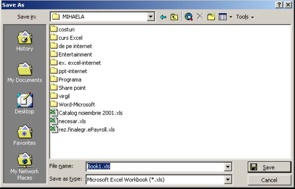 Dupa aparitia acestei casute trebuie sa specifici un nume pentru registrul de calcul in campul File name si locatia fisierului in campul Save in. Locatia fisierului poate fi orice folder de pe harddisk-ul personal sau orice folder pe care ai drepturi dintr-o retea de calculatoare. Initial, Excel iti ofera folderul My Documents dar tu il poti schimba selectand o noua resursa fizica sau un nou folder in meniul Save in. Numele registrului de calcul este urmat de extensia .xls. Dupa ce ai introdus numele unui registru de calcul trebuie sa faci click pe butonul Save ca sa finalizezi operatia de salvare. Toate subsecventele nou create de la ultima salvare vor actualiza registrul de calcul existent fara sa mai ceara numele lui. Salvarile ulterioare se realizeaza cu secventa FileSave.