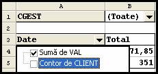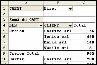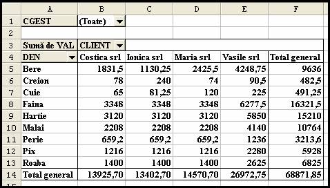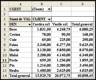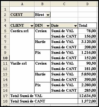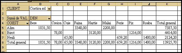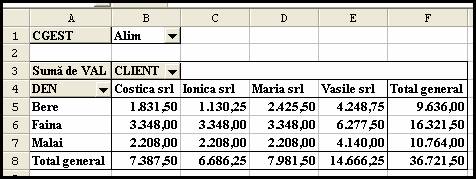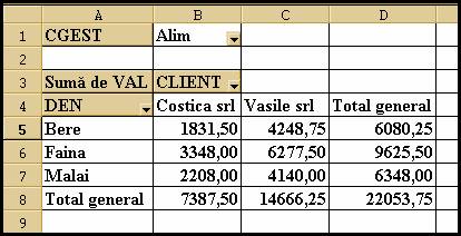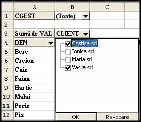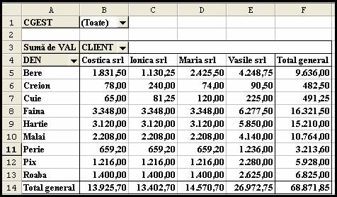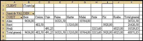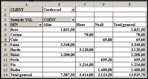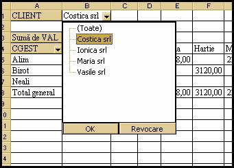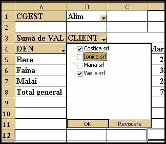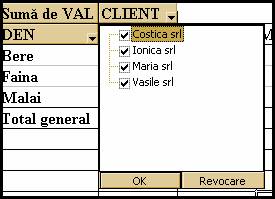 Īn Tabelul Pivot din Fig 13.7 nu mai avem toti clientii pentru ca am facut desfasurarea din Fig 13.8 si am ales pe Costica srl.