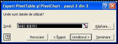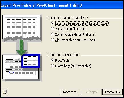 Īn Fig 13.4, lista īn discutie, din care va rezulta raportul pivot, apare īn ferestruica Zona. Zona aceasta apare automat īn ferestruica daca lista este compacta, fara linii si coloane goale. Nu ne ramāne decāt sa facem clic pe Urmatorul. |