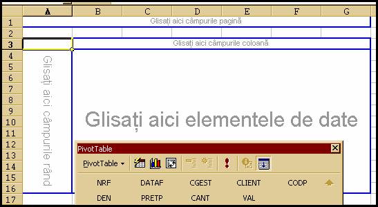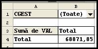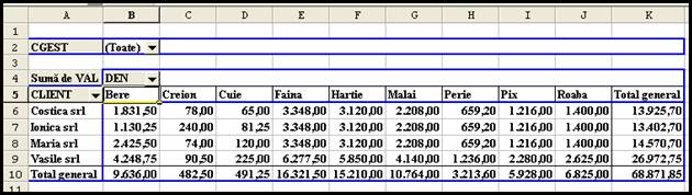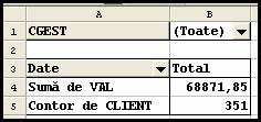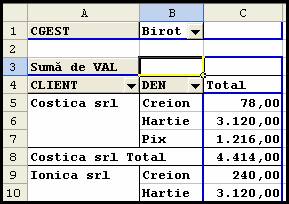 Cānd a fost glisat si cāmpul VAL a aparut īntreg Tabelul Pivot. Va trebui sa īncercati de mai multe ori. Veti constata ca din una si aceiasi baza de date va vot iesi mai multe rapoarte Pivot.