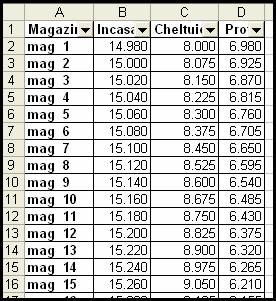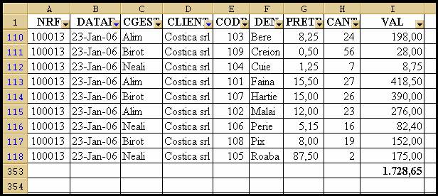 Când s-a facut clic pe Filtrare automata apare tabelul din Fig 14.4 care are peste 352 rânduri.