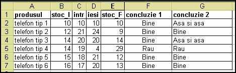 Un depozit la sfârsitul lunii îsi analizeaza vânzarile[1]. Cu alte cuvinte Stocul Final de la sfârsitul lunii, sa fie cât mai mic fata de Stocul Initial, adica cel de la începutul lunii. Analiza se poate face în doua moduri, concretizate în Fig 8.2 prin concluzie 1 si concluzie 2. În Fig 8.2 avem rezultatele a doua variante de folosire a functiei IF
