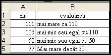 =IF(A2>=100; IF(A2>110;"mai mare ca 110";"mai mic sau egal cu 110");IF(A2<=50;"mai mic sau egal cu 50";"Mai mare decât 50")) Observati: câte paranteze sunt deschise, tot atâtea sunt închise. |