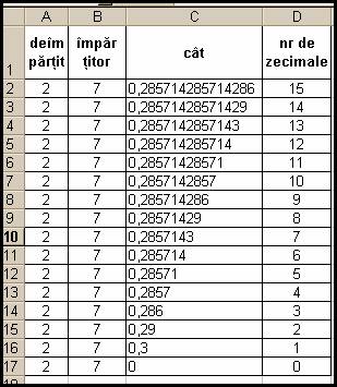 Prin rotunjire īntelegem īn mod obisnuit stabilirea rezultatului la un numar īntreg. EXCEL-ul īntelege altceva. Īn Fig 5.1 vedem cum este afisat rezultatul īmpartirii lui 2 la 7. Observati ultima zecimala care se modifica sau nu se modifica īn functie de ce cifra este dupa ea.