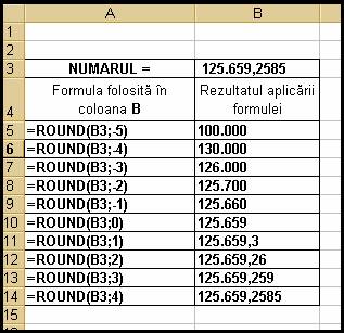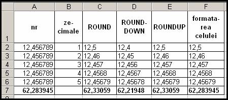 Cea mai "populara" rotunjire este cea prin Formatere , cānd stabilim cāte zecimale sa aiba un numar ., sub ce forma sa fie afisat etc. Nu o putem controla īn totalitate. Face rotunjiri care nu ne convin. Rotunjirile apar numai pe ecran, īn memorie numerele nu sunt rotunjite si cāte odata convine acest lucru altadata nu. Revenim asupra ei.