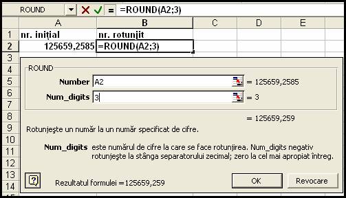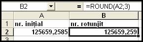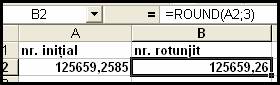 Avem numarul 125659,2585 īn A2 vezi Fig 5.6 si vrem ca īn B2 sa apara numarul rotunjit prin aplicarea functiei ROUND(). Pentru a apela functia ROUND() urmariti Fig 5.5.
