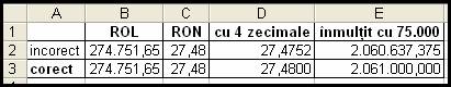 Se aplica rotunjiri dupa metoda clasica aratata mai sus. Rotunjirile sunt numai pe ecran. EXCEL pastreaza īn memoria sa toate zecimalele. |