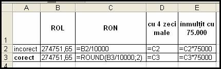 Acesta este textul de lege (copiat ca atare) care ne intereseaza si pentru care vom arata cum se fac conversiile cu EXCEL si ce "capcane" exista, pentru ca de multe ori se greseste si nu se stie de ce. Urmariti Fig 5.12 si faceti acel tabel pe calculator. Suma initiala a fost rotunjita la sute, col B, apoi rezultatul a fost īmpartit la 10.000 si a rezultat col C. Īn col D rezultatul din col C a fost afisat cu 4 zecimale sa se vada ca nu sunt zecimale ascunse