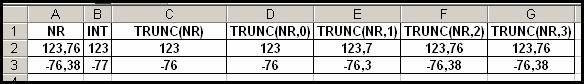 Daca numarul de zecimale lipseste se presupune ca este 0. cānd e vorba de numere pozitive, seamana cu INT,l dar la numere negative difera. De aici se nasc confuzii. Zecimalele nu se rotunjesc, se trunchiaza, adica se taie! Functia INT la numere negative, rotunjeste la īntreg, iar TRUNC retine partea īntreaga.