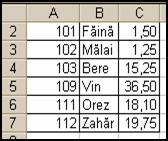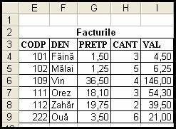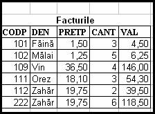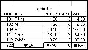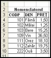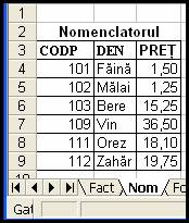 Prima Foaie de lucru va fi Fact (FACTURI). Aici facem capul de tabel ca īn Fig 10.1 A doua Foaie de lucru Nom (NOMENCLATOR) Īn foaia Nom facem urmatorul tabel (lista): acesta va fi Nomen-clatorul. Fig 10.3. Īn acest NOMENCLATOR codurile produselor sa fie īn ordine strict crescatoare. Poate sa fie "goluri" dar sa nu fie dubluri! Codurile pot fi numere, dar si litere amestecate cu cifre. Denumirile rubricilo 14114t198o r nu trebuie sa fie acelasi īn NOMENCLATOR cu cele existente īn tabelul (lista) FACTURI, pentru ca identificarea se face dupa numarul de ordine al coloanei, nu dupa denumirea ei. Functia, care rezolva acest lucru este: VLOOKUP () B. Fiindca s-a facut redenumirea īn prealabil se īnteleg mai usor argumentele. Functia este scrisa īn Foaia Fact iar Nomenclatorul se gaseste foaia Nom. |