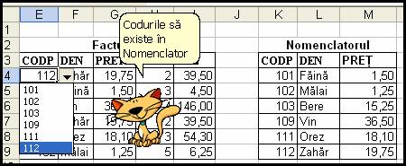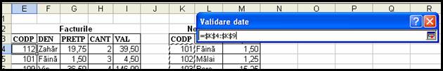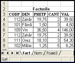 Īn sens general īn informatica, prin validare, se īntelege verificarea datelor de intrare īntr-un program de calculator. Īn cazul nostru e necesar sa aducem Nomenclatorul īn aceiasi Foaie de lucru cu Tabelul facturilor, pentru ca altfel nu functioneaza comanda Validare. A fost adus si lucrurile se prezinta ca īn Fig 10.13. Mentin afirmatia ca Nomenclatorul era mai bine sa fie pe o Foaie de lucru separata, nu pentru ca este o regula specifica EXCEL-ului, ci pentru mai multa ordine.
